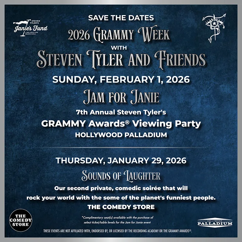 On Sunday, February 1, 2026, experience the magic of Steven Tyler’s 7th Annual Jam for Janie GRAMMY Awards Viewing Party— along with entertainment royalty at the iconic Hollywood Palladium.